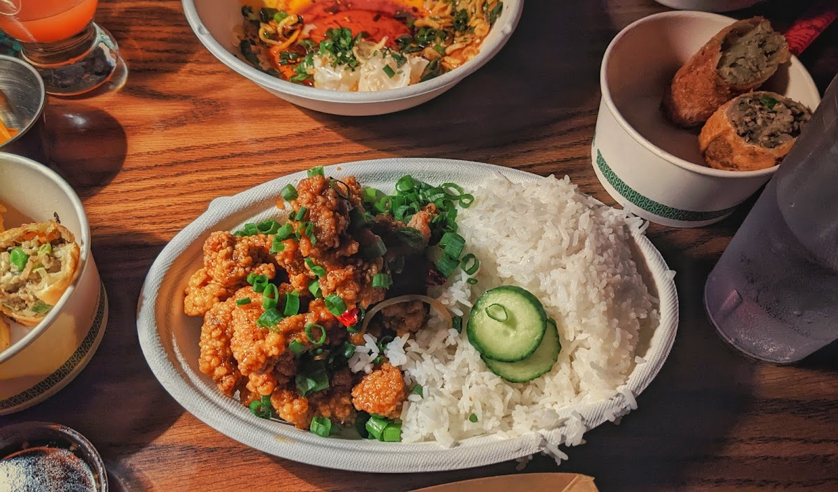 What a lively and cool place to be! There's street parking around the area and it wasn't too hard to find a spot but I'm sure it can get hard when it's peak hours. The bar was a vibe and the ambiance is very cool but it does get very loud when it's busy. There's a decent amount of seating and bar seating available. We got a couple things to try: Dry Fried Long Beans, Spicy Shrimp and Pork Dumplings, Chow Fun, and Chow Mein. The Long Beans were some of the best we've ever had, flavorful, not too soft nor too hard, and I would come back for them! The Dumplings were good but they weren't unique or special. Both Chow Fun and Chow Mein were made well, delicious, and flavorful. Overall, the dishes were good and made well. I wanted the portions to be a bit larger for the prices. We also got the Crimson Tiger Margarita and it was sweet, refreshing, and a good balance to the meal. It was a little bit confusing when we walked in because there was no one in the front dining area. We walked to the back and that's where everyone was. Our waitress and host were very nice and so accommodating! They answered our questions and gave recommendations for what we asked for. Overall, service was phenomenal. Good for small groups, a casual dinner, good drinks, and good food! It was a fun experience and very picture aesthetic.